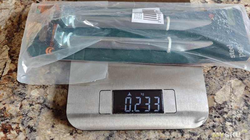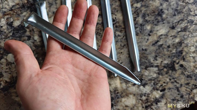 Пакет с V-образными колышками весит почти втрое меньше — 233 г. Да, их и количеством меньше, но даже в пересчёте на 10 штук, они заметно легче.
