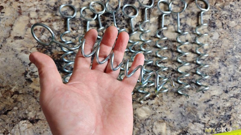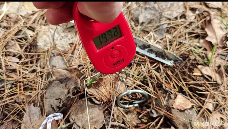Вытягивается колышек легко, буквально двумя пальцами. Максимальное значение на безмене составляет всего 1,26 кг. Таким колышкам в Астрахани делать нечего. Шквальные ветра выдернут палатку с этими колышками за пять минут.