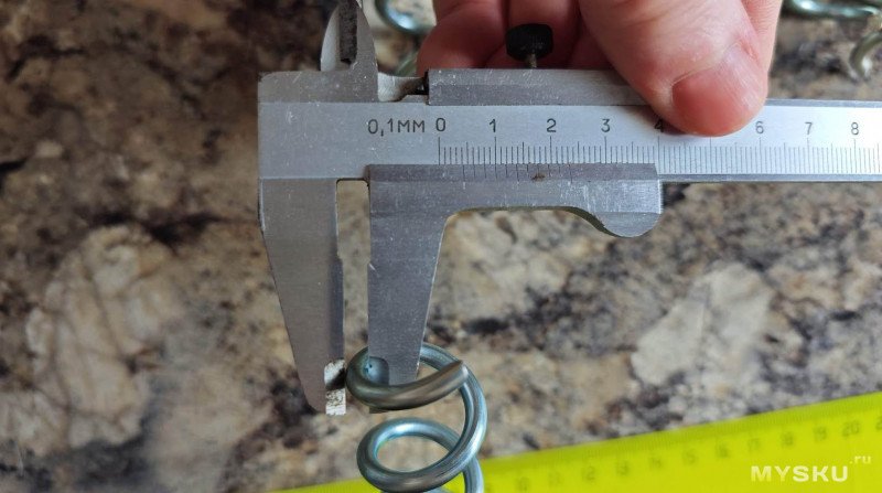 Повторяем опыт с безменом. Я опасался, что его крюк будет соскакивать с плоской шляпки колышка, но нет, зацеп оказался надежным.