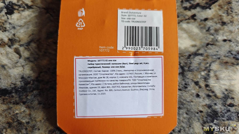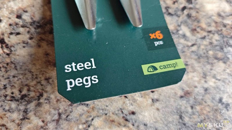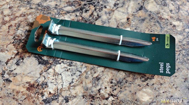 Как и другая туристическая продукция Outventure, колышки прикреплены к картонному основанию пластиковыми стяжками. Две группы по 3 штуки.