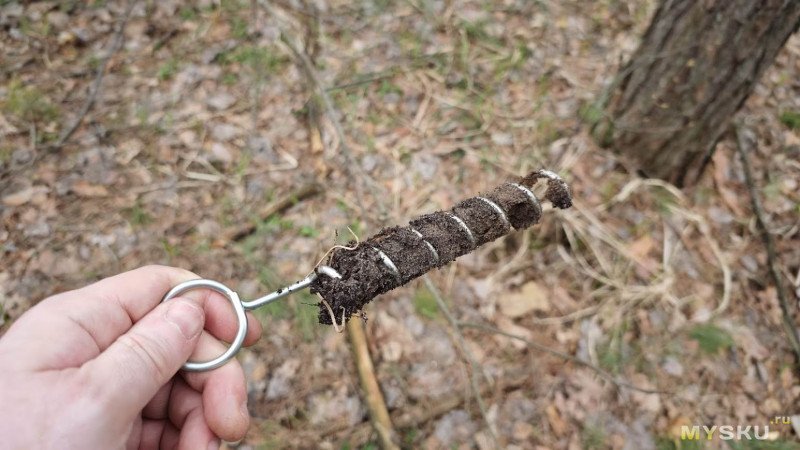 V-образный колышек также собрал немного грязи, но существенно меньше, чем винтовой. Кстати последний очищать оказалось даже легче.