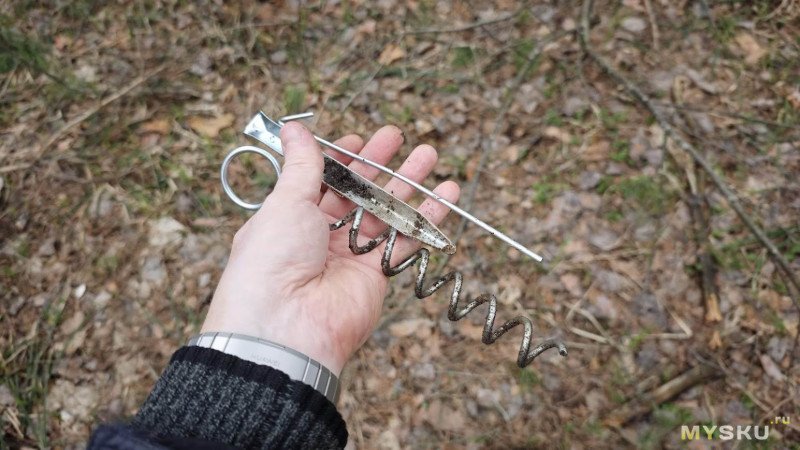 Двумя руками я его конечно выдернул, но зафиксировать показания уже не смог. Предел безмена всего 25 кг. Вот такую колбасу с грунтом вытащил колышек вместе с собой.