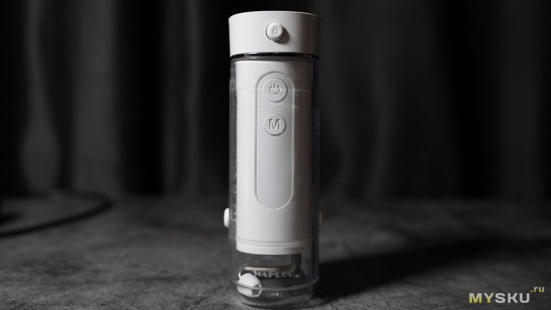 Ирригатор изначально уже в сложенном состоянии по принципу матрёшки, где по сути тело ирригатора утоплено в полость резервуара. Корпус выполнен из белого пластика с глянцевым покрытием. С боковой стороны наверху под заглушкой находитcя не проприетарный, а распространённый USB-C разъём для зарядки встроенного АКБ. На передней части две две кнопки (включение и смена режимов)