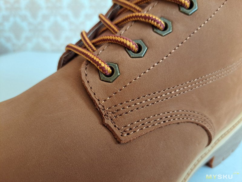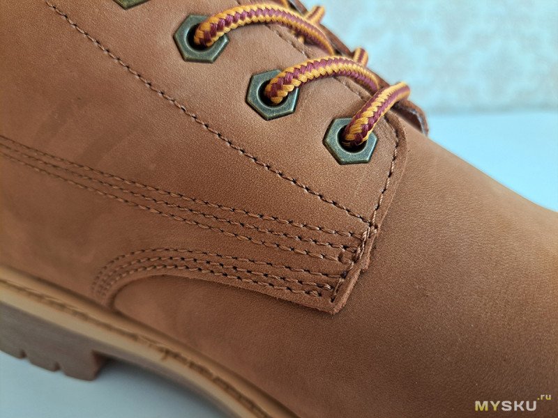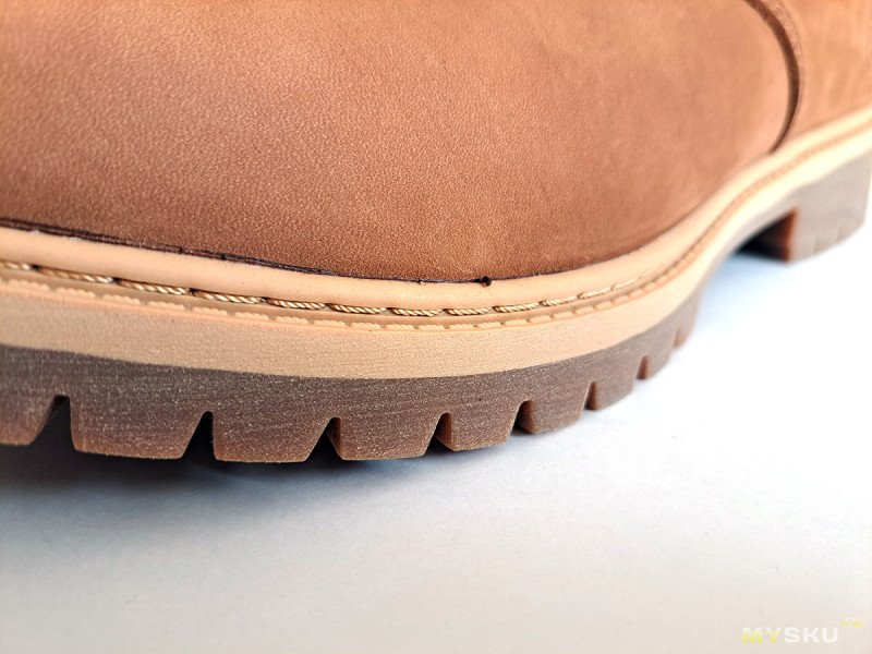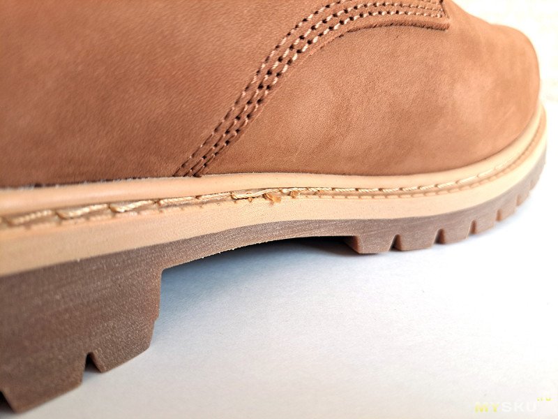 Единственный заметный дефект, вот этот жгутик из клея. Ну и понятно, что никакого прямого литья подошвы, как у Тимберлендов тут нет, метод крепления подошвы: клеепрошивной.