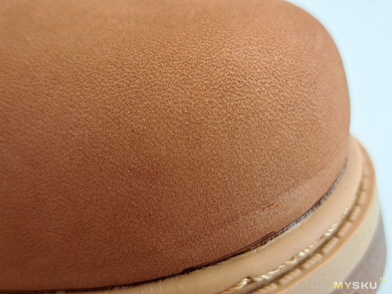 Кожа натуральная, толстая. Обещается коровья, но меня смущают следы от волосков. Группы по три, больше характерны для свиной. На рекламных видео нубук был очень бархатистый и переливчатый. Но у моей пары ворсистость пониженная.