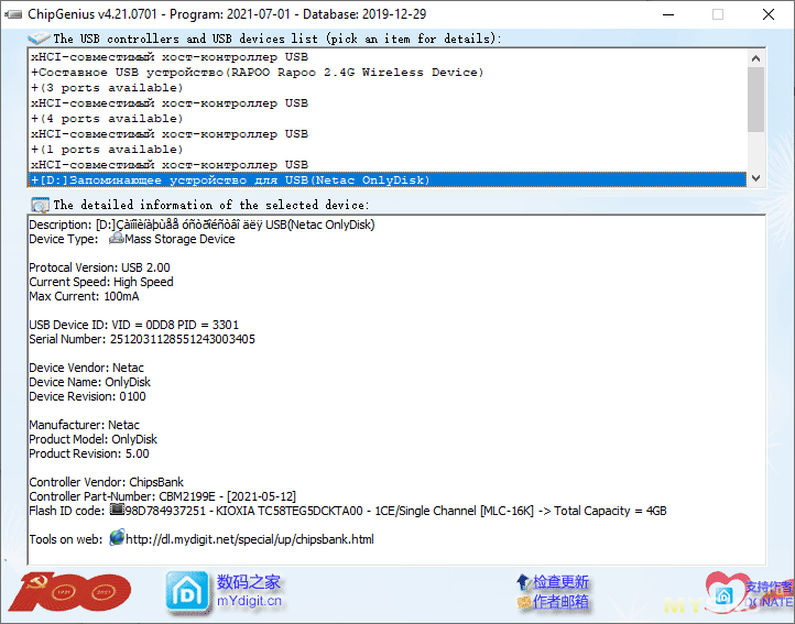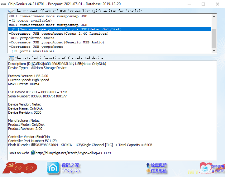 Вторая программа ChipGenius определила внутри наилучшую конфигурацию на памяти Kioxia и честные 64 Гбайт.