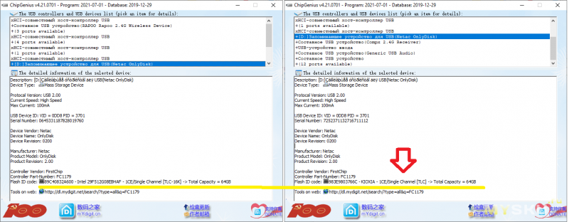 Пробуем другую утилиту. Отличия во флеш-памяти: у первой стоит Intel, у второй — снова Kioxia (Toshiba). Обе TLC. И что самое интересное обе определяются как модели на 64 Гбайт?! Как думаете, ошибка или производитель просто поленился менять производственную линию? Может попробовать их перепрошить?