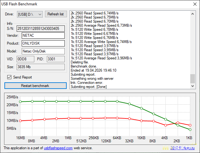 Начнем с тестирования младшей версии Netac U116 4Gb. В устройстве определился даже тип NAND-памяти, что приятно, а также прошивка.