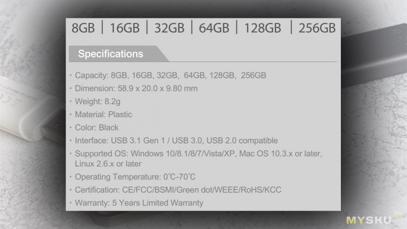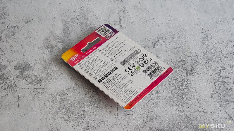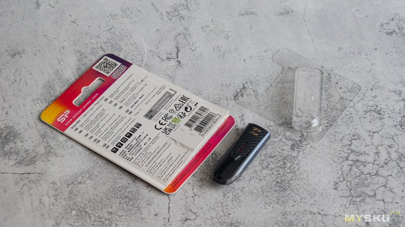 Накопитель поставляется в стандартном для подобных устройств картонном блистере с прозрачным пластиковым окошком. На лицевой стороне сразу бросается в глаза объем памяти — 256 ГБ, а также указание интерфейса USB 3.2. Слоган «Memory is Personal» подчеркивает позиционирование устройства как персонального хранилища данных.