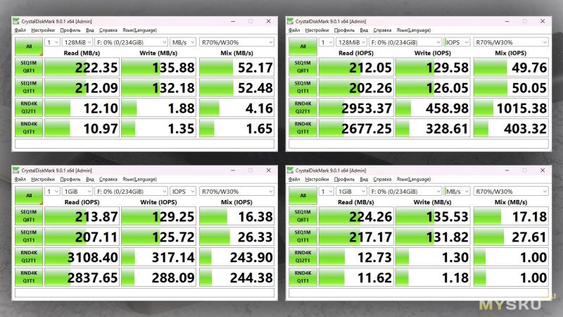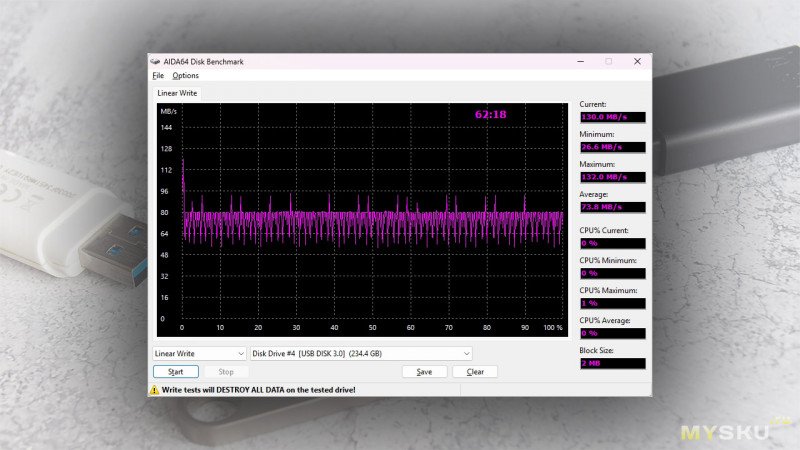 AIDA64 престарелой, но честной (в сравнении со свежими) версии 4.70 показывает умеренную «расческу» графика линейной записи с диапазоном 60-80 МБ/с, причем скорость скорее стремится к верхней границе этого диапазона. На заполнение всего объема флешки, а это фактически 234 ГБ, потребовалось чуть больше часа – 62 минуты и 18 секунд.