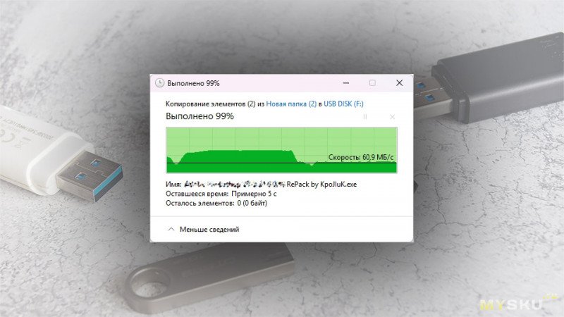 При типичном сценарии использования (копировании данных – установочные дистрибутивы) флешка тоже показала себя вполне прилично. Сначала флешка быстро разогналась до 120-130 МБ/с, но примерно на середине объема просела до 60-65 МБ/с, но ниже не падала. Объем в 5,08 ГБ был записан за 1 минуту и 2 секунды, что очень и очень неплохо.