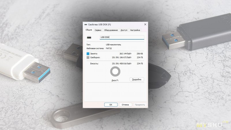 Накопитель поставляется отформатированным в файловую систему FAT32, доступный пользователю объем составляет около 234 ГБ.