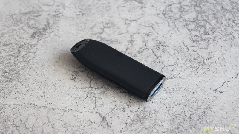 Выдвижной коннектор металлический, типа USB-A – традиционных для обычных флешек. Внутренняя пластиковая часть с контактной площадкой имеет синий цвет, что говорит о стандарте USB 3.2 Gen 1 или по-простому USB 3.0.