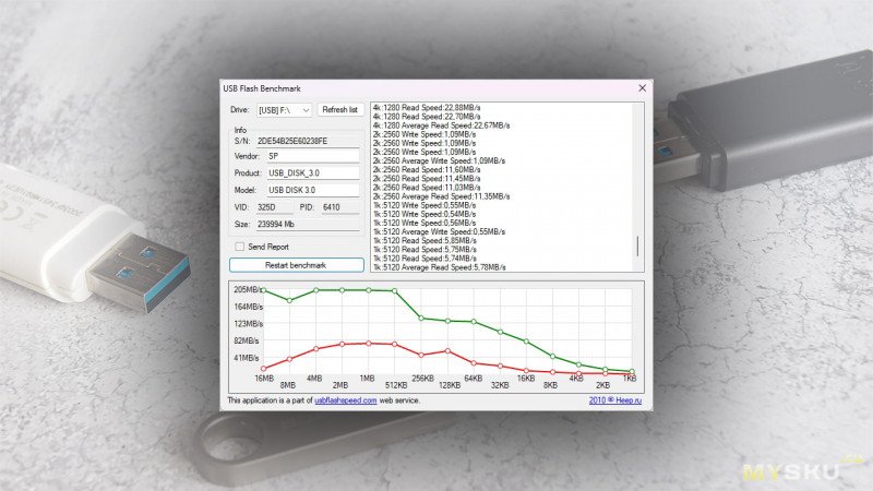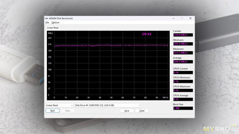 Линейное чтение по уже записанным данным рисует почти ровную линейку графика с очень приличной скоростью 205-210 МБ/с. Очень неплохо для, опять же, типичной флешки.