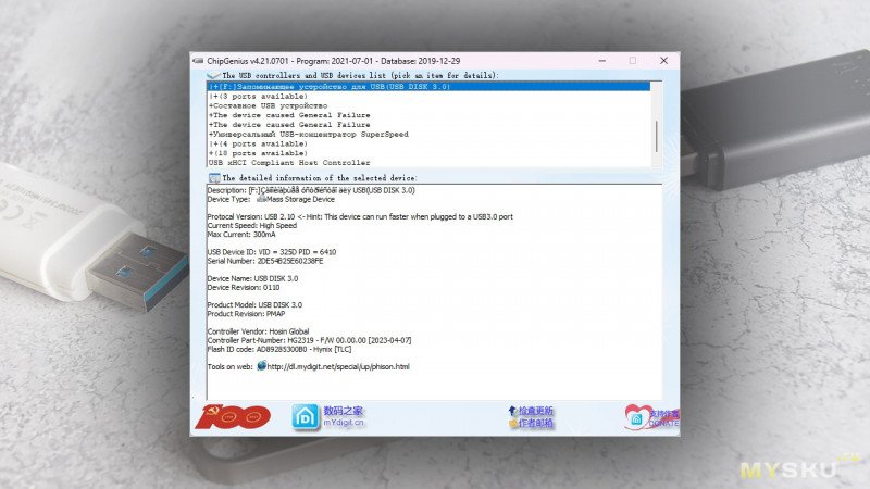 Заглянуть внурть флешки поможет утилита ChipGenius. Она подсказывает, что в качестве контроллера здесь используется HosinGlobal HG2319, а чипы памяти здесь TLC от Hynix. Ну, по мнению утилиты – так.