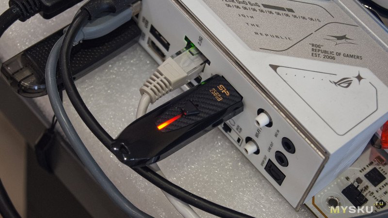Для проверки скоростных возможностей Silicon Power Blaze B25 256 ГБ использовался ПК с материнской платой ASUS ROG Strix B860-A Gaming WIFI. Обозреваемая флешка была подключена в соответсвующий порт на I/O-панели.
