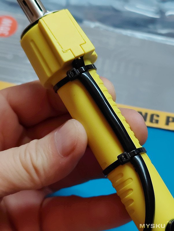 В общем и целом понравился. Единственный минус — плохо заделан провод питания. Видно, что проводники касаются металлической тарелки, которая крепится к ручке и существенно нагревается. Может, конечно, нагревается и не критически, так как пластик ручки не плавится, но, я думаю, что если провода не будут её касаться, будет лучше. Поэтому я слегка потянул за шнур, чтобы провода перестали касаться этой тарелки, но при этом из корпуса вылез край оболочки шнура и стали видны провода — провод зачистили очень далеко. Пришлось запихивать его обратно, а чтобы он опять случайно не вылез использовал наше всё — кабельные стяжки, притянув провод к рукоятке.