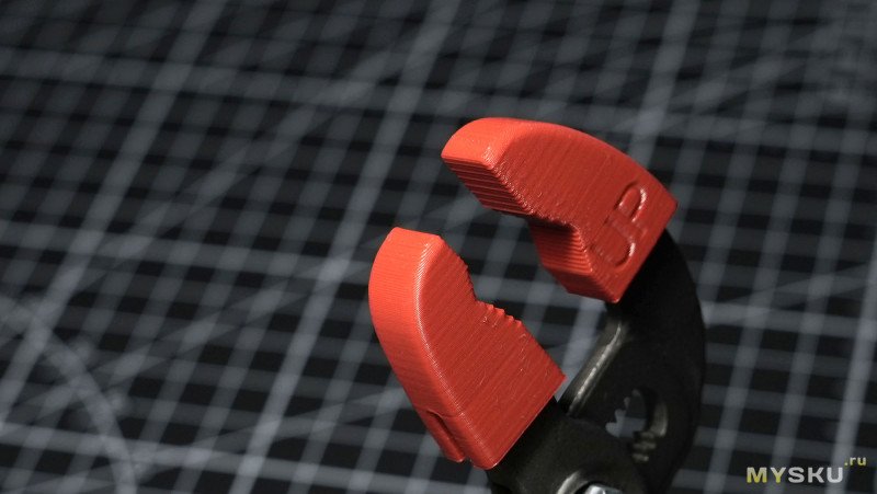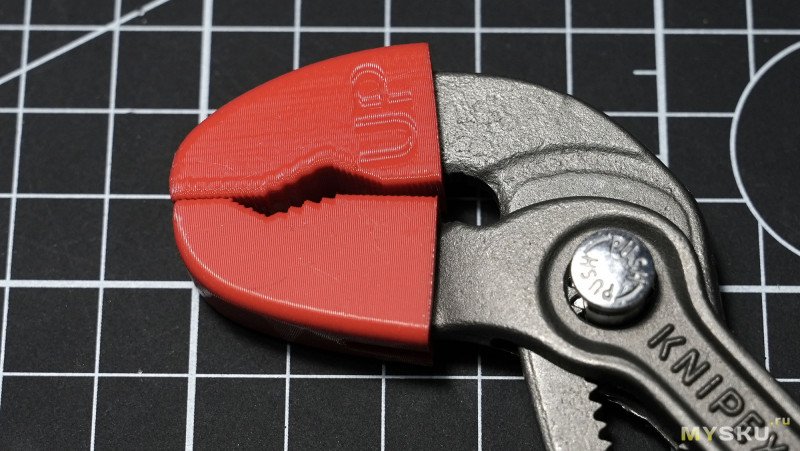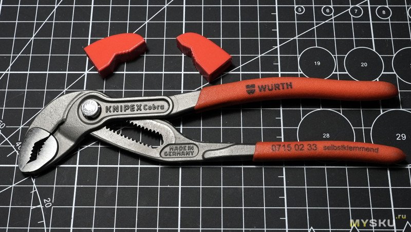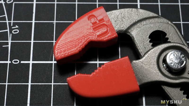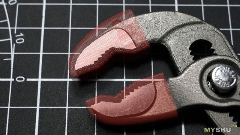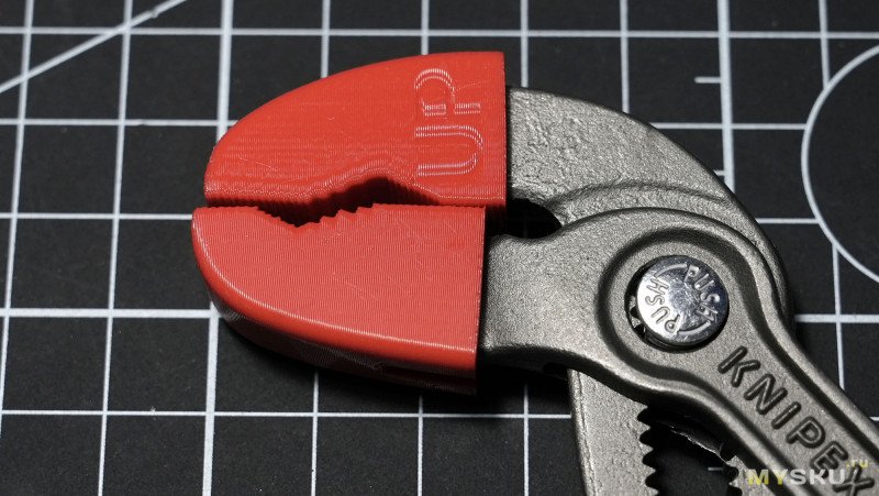 Иногда бывает нужно зажать крепёж или деталь закруглённой формы. Плоские переставные клещи с гладкими губками под это дело не подходят. «Зубастые» Knipex Cobra подходят, так как имеют V-образную выемку между губками, но чтобы острые зубья не царапали детали, решил заиметь защитные накладные губки для моих клещей 8701180. Оригинальные губки слишком дорогие, но попался лот с напечатанными на 3D-принтере губками по цене, которая меня устроила. Посмотрим.