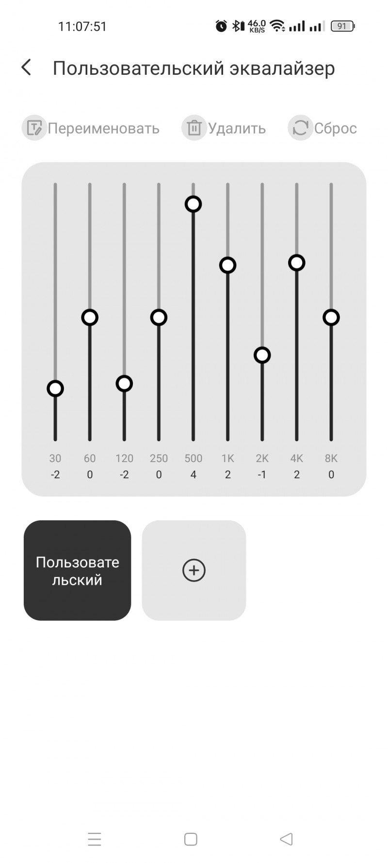Второй подстраницей размещается эквалайзер с возможностью выбора из предустановленных вариантов или создания своего.