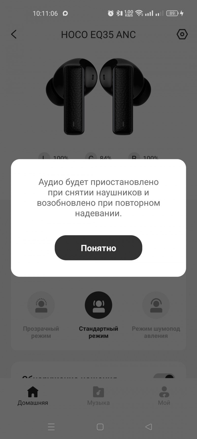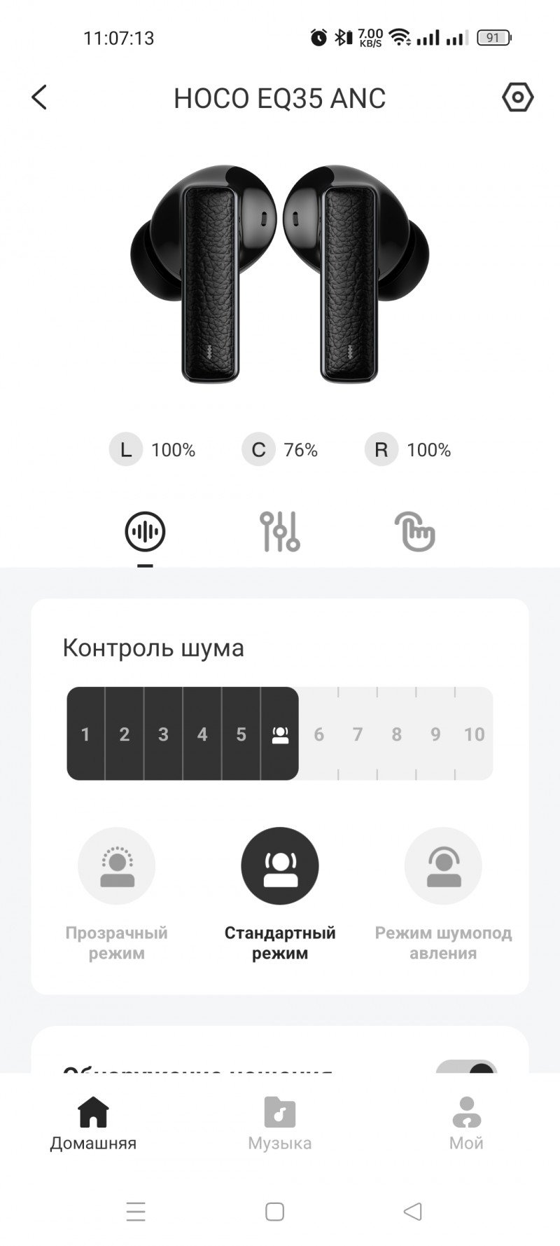 Основная страница предусмотрена, чтобы увидеть уровень заряда наушников и бокса. Обычно этот пункт упускают и можно остаться без подзарядки, если упустить данный пункт. Есть настройка режимов шумоподавления, прозрачности и стандартного пункта. Также в наушниках встроены датчики, которые обнаруживают момент извлечения из уха и ставят на паузу, что тоже крайне редко встречается в наушниках из этой ценовой категории.