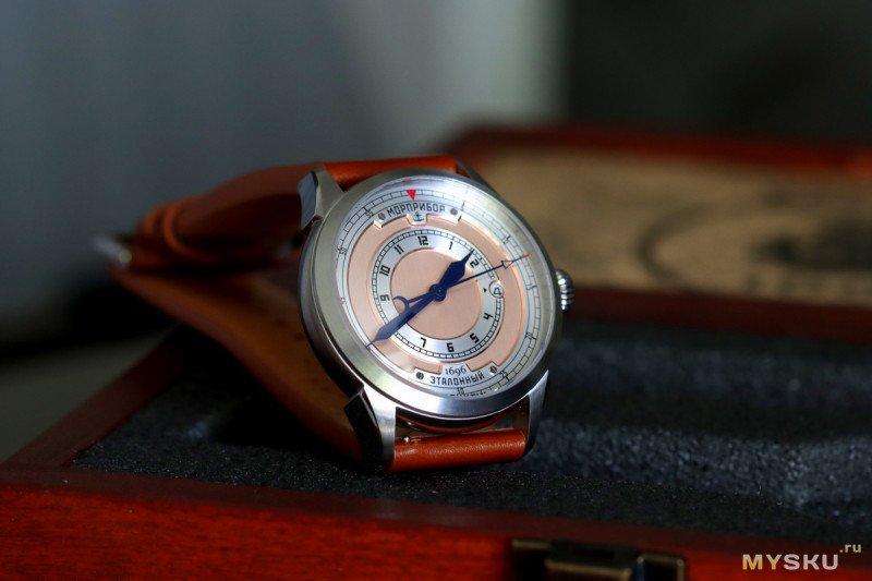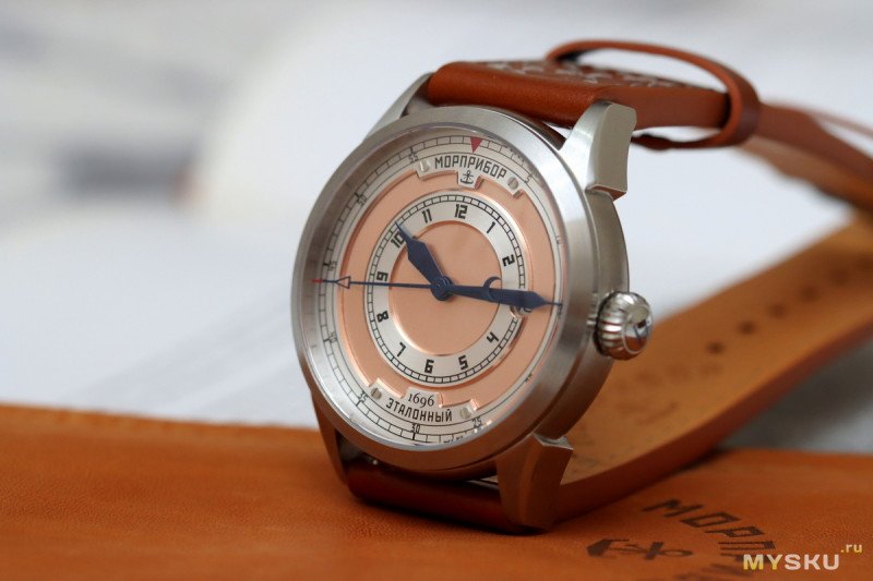 До этого момента при упоминании Морприбора вспоминались брутальные бронзовые часы. Для новой модели в Морприборе решили добавить к бронзе более изящный корпус из нержавеющей стали, оставив при этом высокий уровень водозащиты. Согласитесь, что странно было бы наблюдать в часах, рассказывающих и прославляющих историю флота, простую бытовую защиту от брызг.