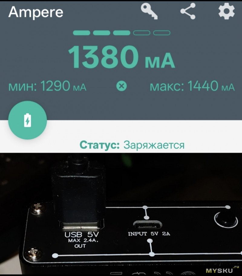 За 5+ часов зарядилось на 100%, поставил на разряд через USB тестер KOWSI KWS-2303С и упомянутую выше «нагрузку», накрутил «свой» комфортный ток, которым планирую заряжать смартфон (1А), и через несколько часов батарея по нулям: