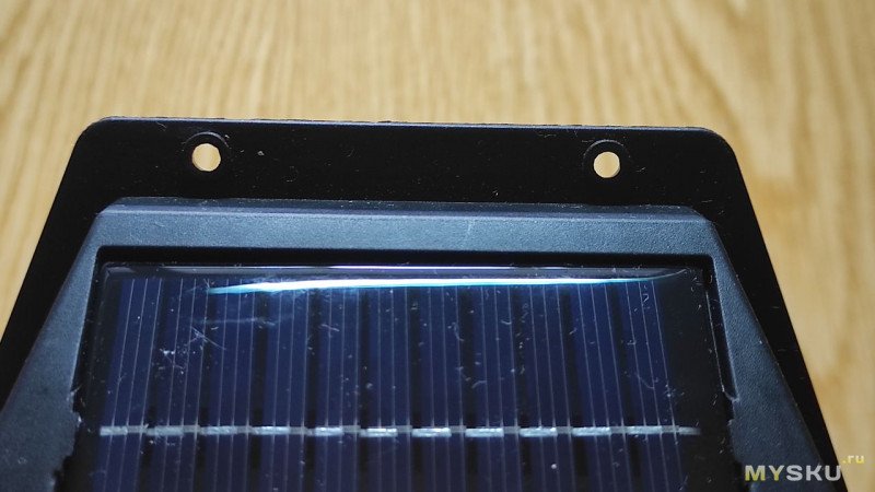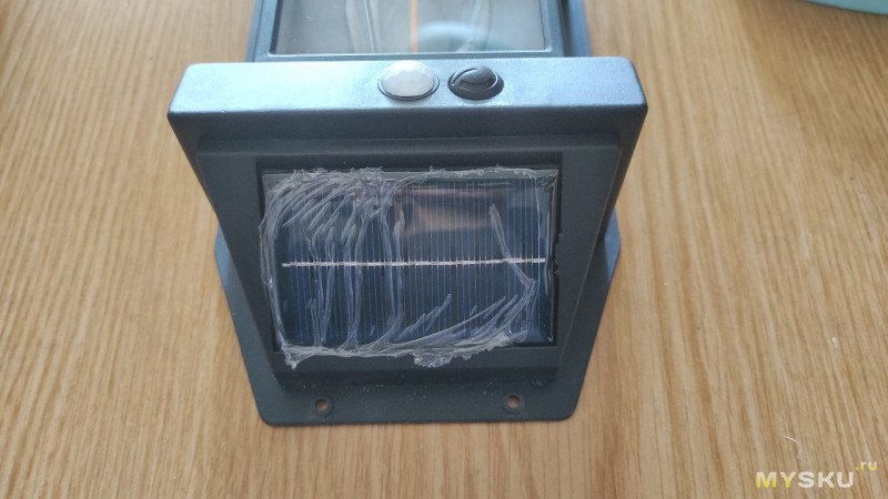 На передней части прикручена плата с датчиком движения и кнопкой. Там же солнечная батарея.