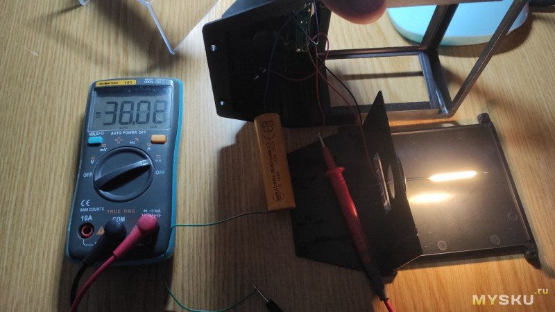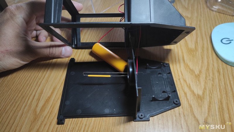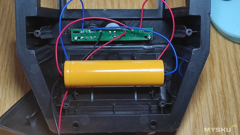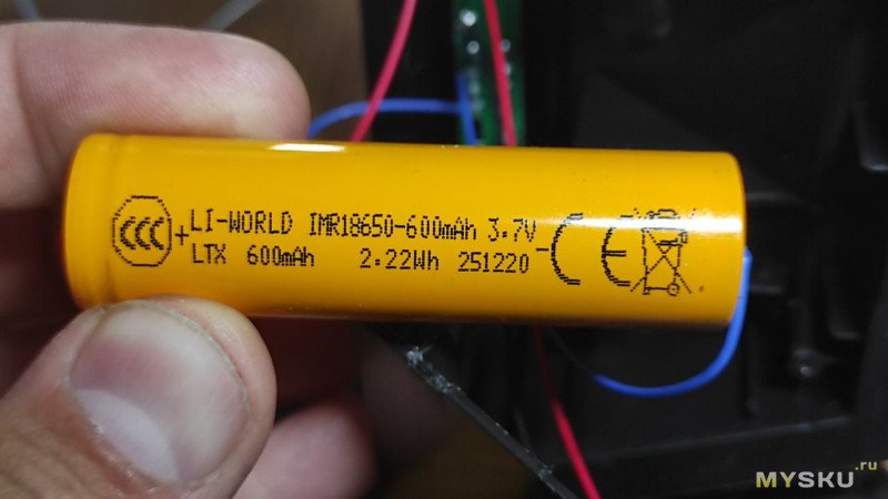 В центре фонаря в креплении стоит аккумулятор 18650 с заявленной ёмкостью 600мАч. Провода к нему просто припаяны.