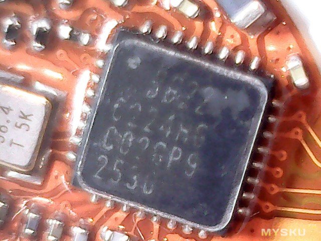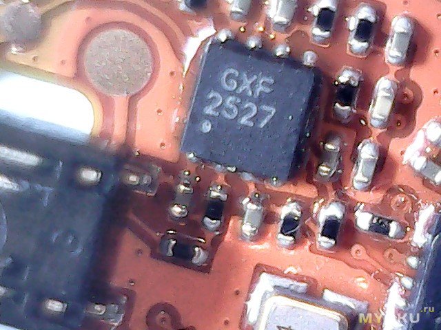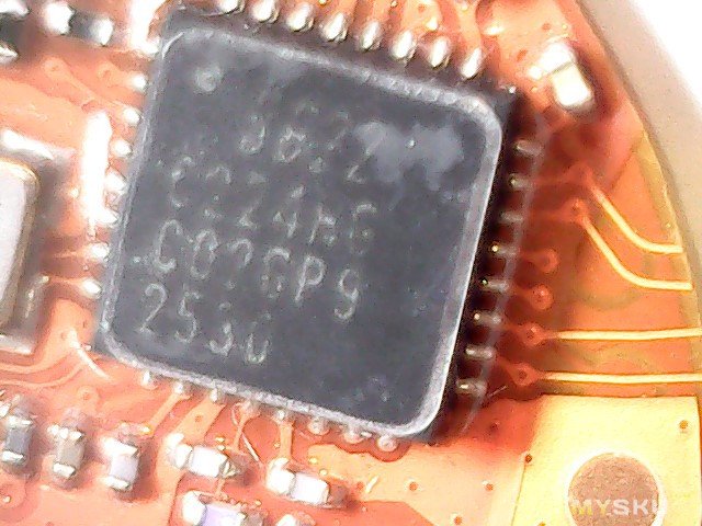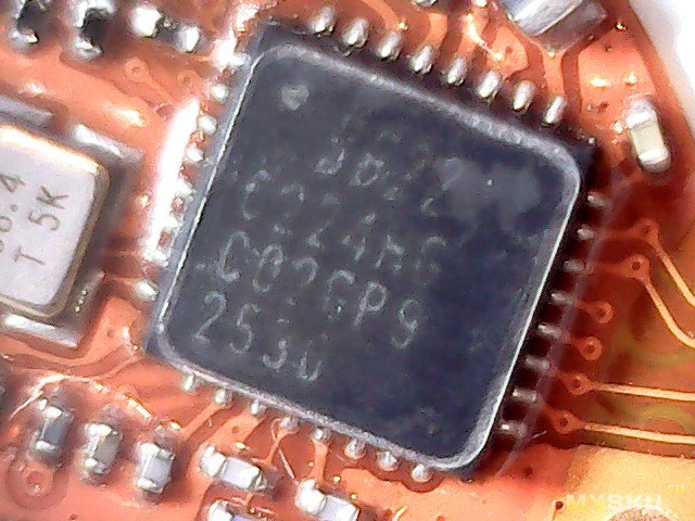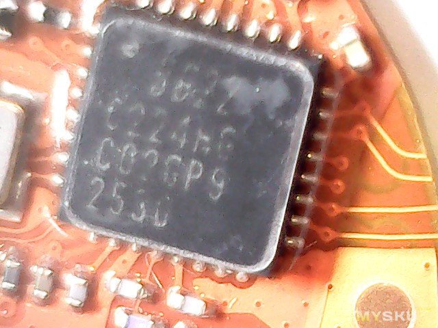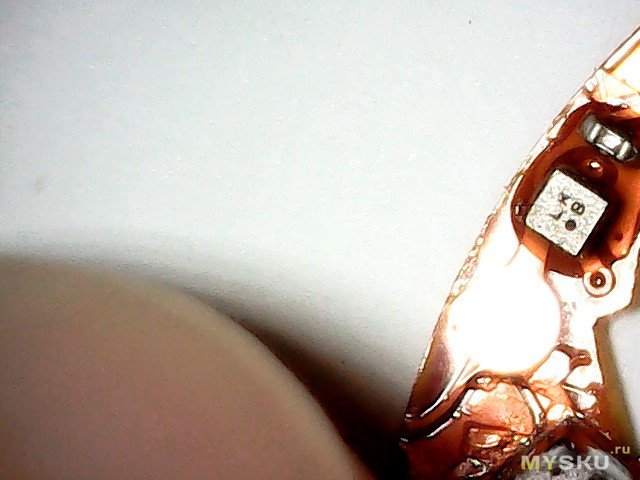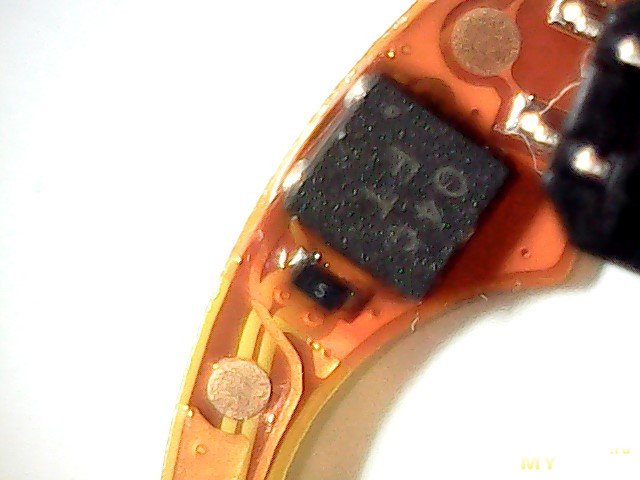 Плата крупнее. Видна многоногая деталь с маркировкой 9822 C224… (насколько смог прочитать), думаю микроконтроллер, кварц, еще какая-то восьминогая деталька с маркировкой GFX 2527, еще какая-то четырехногая деталька с маркировкой 04C FT, деталька с маркировкой LK B (думаю, датчик Холла, она как раз была рядом с магнитом).