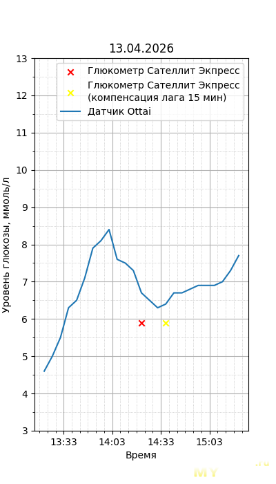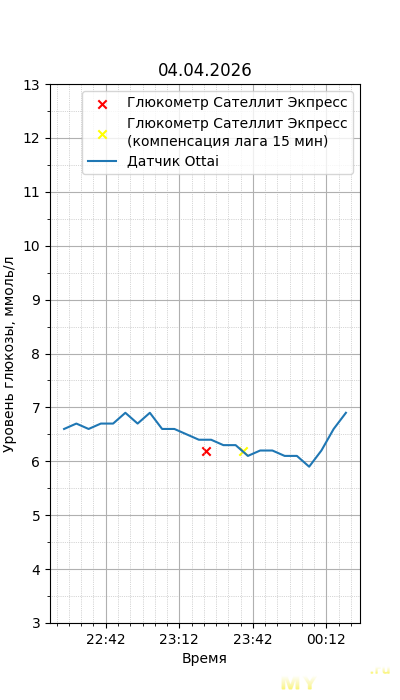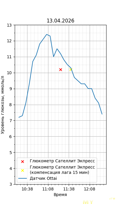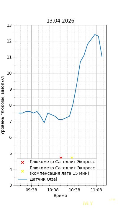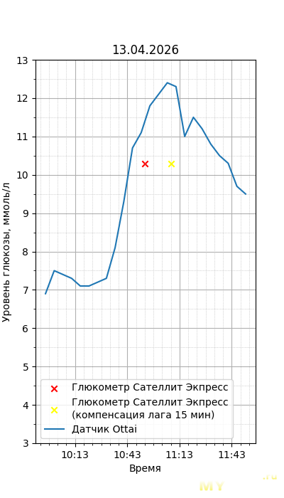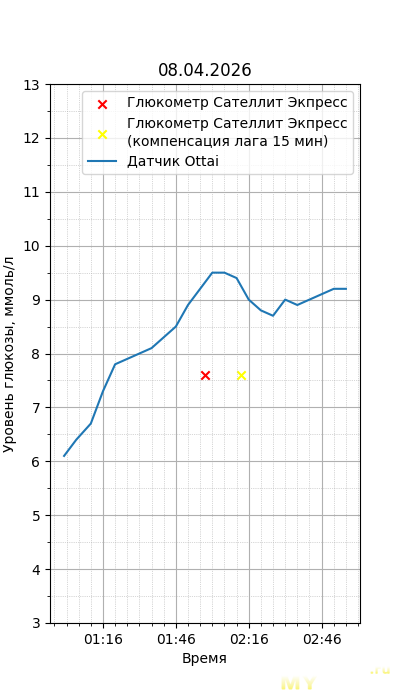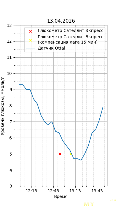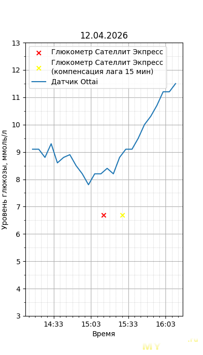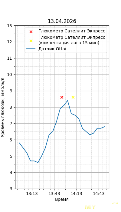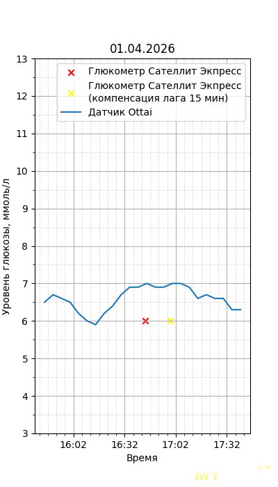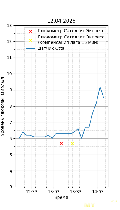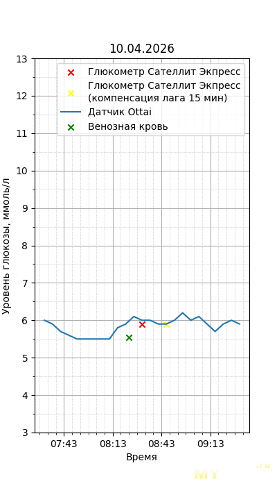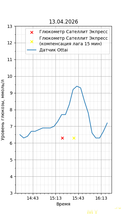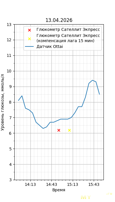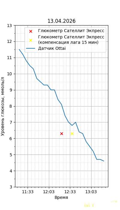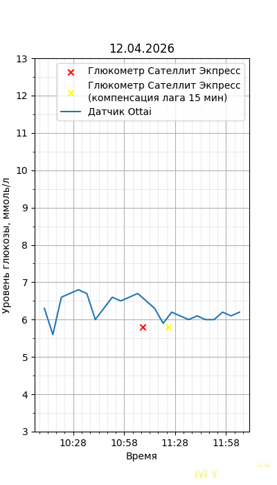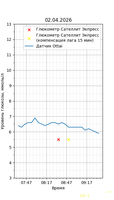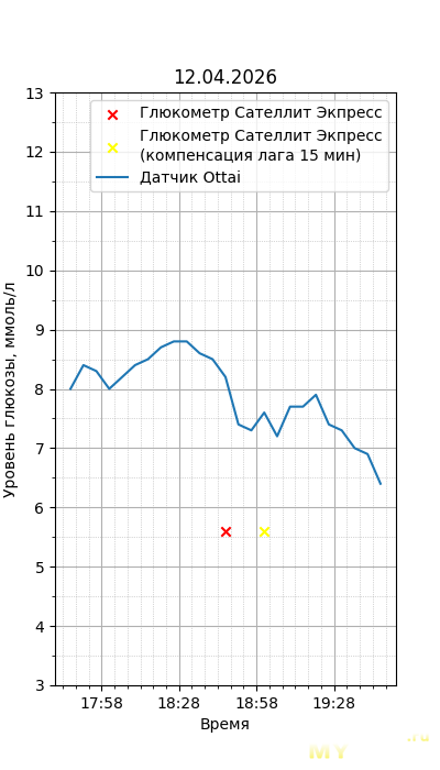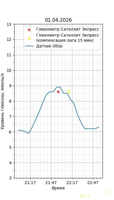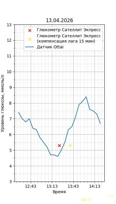Один момент. Глюкометр Сателлит Экспресс калиброван по цельной крови, тогда как большинство зарубежных глюкометров, включая сенсор Ottai, калиброваны по плазме крови. Обычный лабораторный анализ крови из вены также показывает концентрацию в плазме крови, но она чуть ниже, чем в капиллярной (глюкометр), т.к. ткани уже потребили часть глюкозы. Чтобы привести показания Сателлита к плазме крови, нужно их домножить на 1,12. Но это только при более-менее нормальном уровне гематокрита. Если у человека сильная анемия (низкий гематокрит) или полицитемия (высокий) — такой способ будет давать сильную погрешность. Хорошо, что у меня нормальный гематокрит. В итоге показания глюкометра домножил на 1,12.