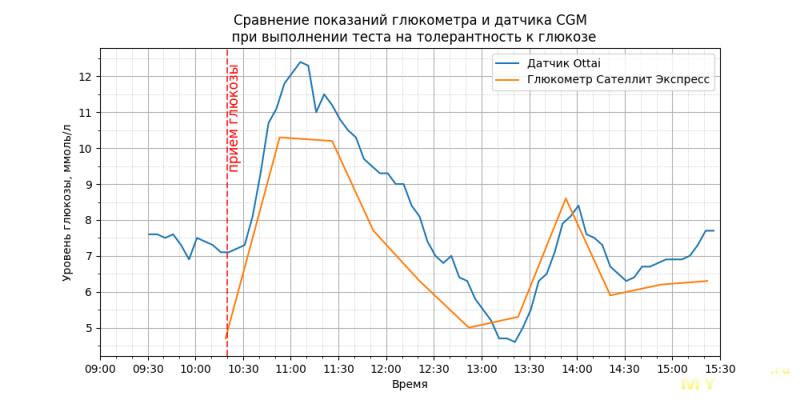 По точности. Т.к. я на себя его налепил, чтобы проверить, то пришлось проверять. В качестве референса выступил глюкометр Сателлит Экспресс. Сначала измерял нерегулярно, т.к. измерять мог только на работе, а работа у меня сменная и не всегда есть время в течение смены этим заняться. Однократно провел измерения сразу 3 разными методами: датчик Ottai, глюкометр и анализ в лаборатории на сахар венозной крови.Затем я забрал глюкометр у близкого человека, такой же Сателлит Экспресс. И решил воспроизвести аналог стандартного теста на толерантность глюкозе: выпивается 75 грамм глюкозы, растворенной в стакане воды, затем через определенные интервалы измеряется сахар крови (в стандартном тесте — это сахар венозной крови через 2 часа после приема глюкозы, я измерял каждые 30 мин. глюкометром, датчик измерял сам каждые 5 минут).