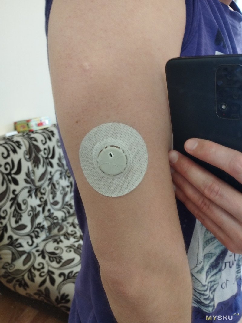 Приложение есть в GoogleStore (у меня андроид). Под iOS вроде тоже есть. Пакетик разрывается, внутри яйцеобразный инсталлятор с 2 крышечками по концам. Под одной кнопка установки, под второй сам сенсор. Место установки (в инструкции рекомендована задняя часть плеча в верхней ее трети) обрабатывается спиртовой салфеткой. Откручивается крышка сенсора. Открывается крышечка кнопки. Установщик плотно прижимается к месту установки и нажимается кнопка. Кнопка довольно тугая. Несмотря на внушительную иглу, установка совершенно безболезненная. Как увидим дальше, сама игла является только проводником для гибкого сенсора, после установки датчика игла втягивается обратно в инсталлятор. После установки сенсор уже приклеен. Чуть его прижать для более плотной фиксации и сверху наклеить удерживающий стикер. Затем открывается приложение, создается аккаунт (можно использовать учетки гугла, яндекса и по-моему ВК — удобно для РФ). При первом входе позволяет выбрать единицу измерения: ммоль/л, или мг/дл, пишет что впоследствии нельзя будет изменить. Для РФ надо ммоль/л, это общепринятая единица. Нажимается установить сенсор — сенсор ищется по bluetooth и спаривается с помощью сканирования QR кода, находящегося на инсталляторе, поэтому его нельзя выбрасывать до спаривания датчика. Проблем с подключением не возникло — на 2 устройствах (2 разных датчиков) на CDSdroid (кастом на основе операционки google pixel) и на MIUI. На MIUI с трудом отсканировал QR код, но это ограничение камеры телефона, трудно фокусируется на близком расстоянии, но получилось.