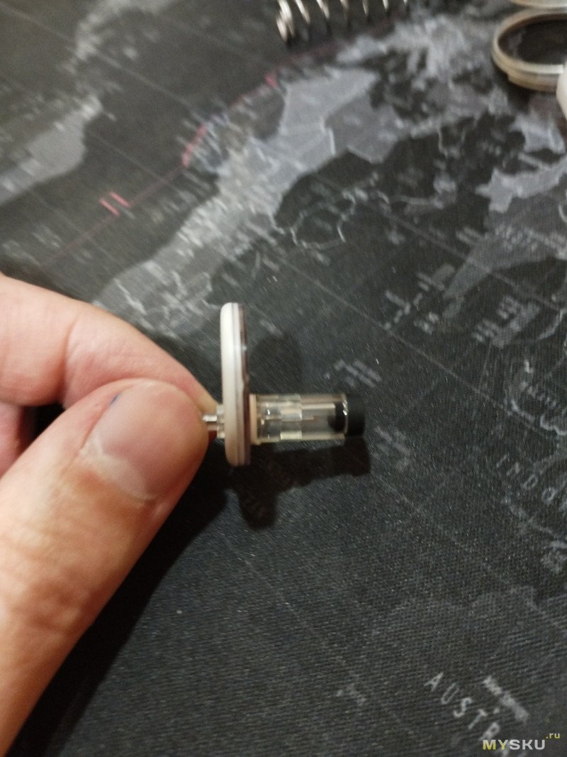Снятая кнопка. Видны защелки, удерживающие в рабочем состоянии. Если надавить на один 4 из торчащих шпеньков, можно выдвинуть иглу в рабочее положение.