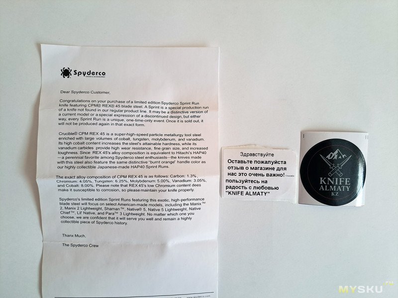 Внутри бумажка с описанием стали не имеющей никакого отношения к ножу в данной коробке.