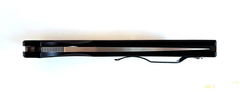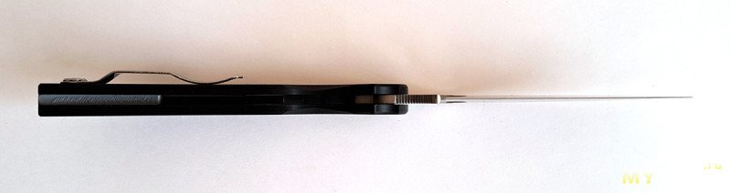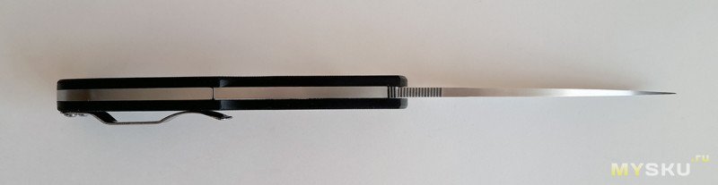 На этом фото видны все огрехи изготовления разом. Кончик клинка не по центру. Несимметричная заточка. Бэкспейсер изнутри обработан топорно. Так же обработка краев клипсы оставляет желать лучшего. На самом деле, реальным «косяком» является расположение кончика клинка, а остальное присуще большинству бюджетных ножей (даже брендовых).