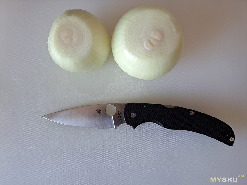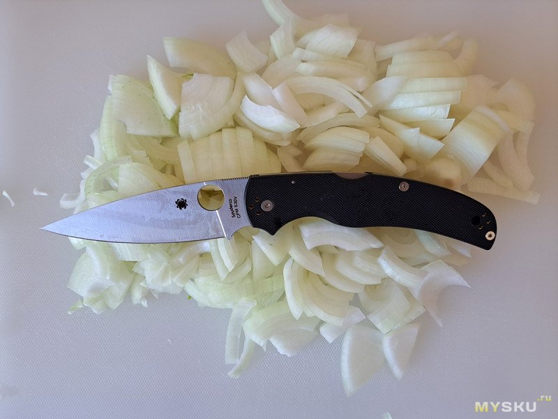 Пока что, мой любимый складной кухонник это китайская копия Spyderco Military. Причем, у оригинала клинок потолще и сведение тоже. Так что, вероятно, и рез по продуктам менее агрессивный. Зато сталь в разы дольше держит заточку, если это важно при таком сценарии использования.