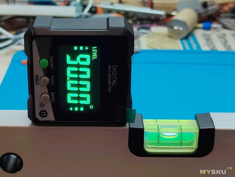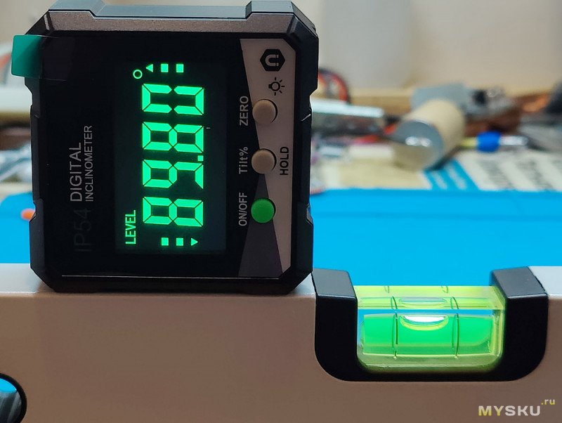 Точность измерений можно легко проверить как и для любого пузырькового уровня: ставим на какую-нибудь ровную жесткую поверхность, записываем показания, потом поворачиваем на 180 градусов и снова записываем показания. Считаем разность, делим пополам и получаем +\- погрешность измерений. Пример — на фотках.