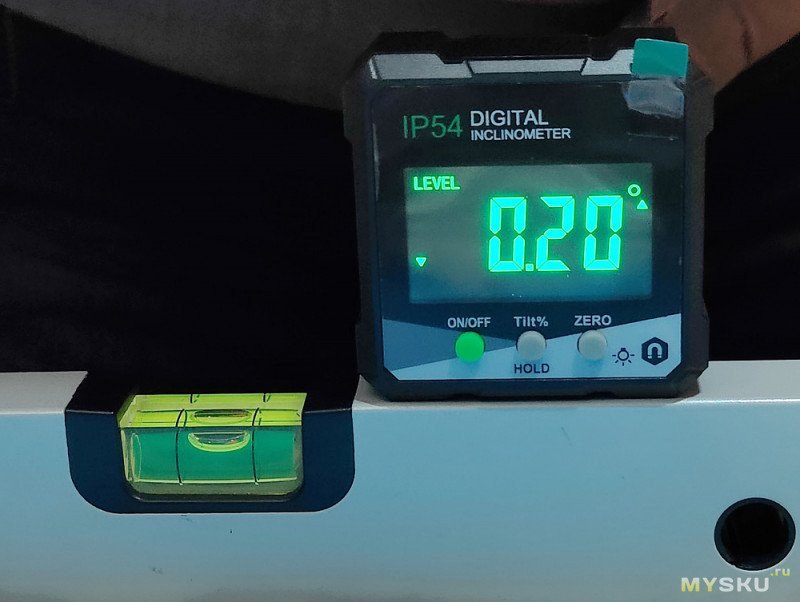 Есть кнопки «замораживания» показаний (кнопка HOLD), изменения показаний с градусной меры в процентную (кнопка TILT%: 0 градусов = 0%, 90 градусов = 100%) и обнуления (кнопка ZERO). Обнуление бывает необходимо для относительных измерений — когда наклон определяется не от горизонта, а от какой-то другой плоскости. Обнуление не сохраняется при выключении — не путать с калибровкой.