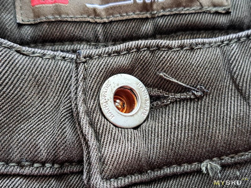 Строго говоря, брюки пошиты не из денима, а из хлопковой смесовой ткани, так что это не традиционные джинсы. Покрой классический, с пятью карманами и двойными швами, поэтому вполне адекватно будет называть их джинсовыми брюками.