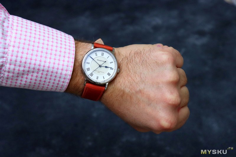 Издали эти часы можно перепутать, например, с немецким Nomos.
