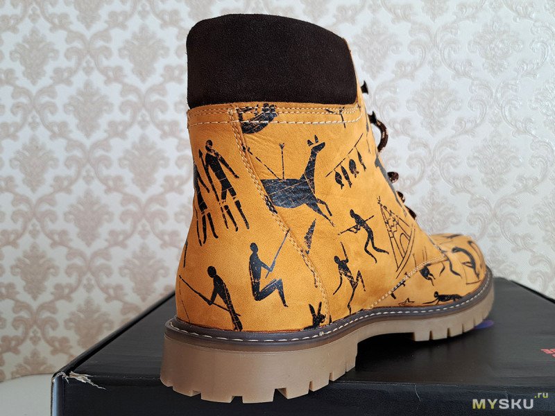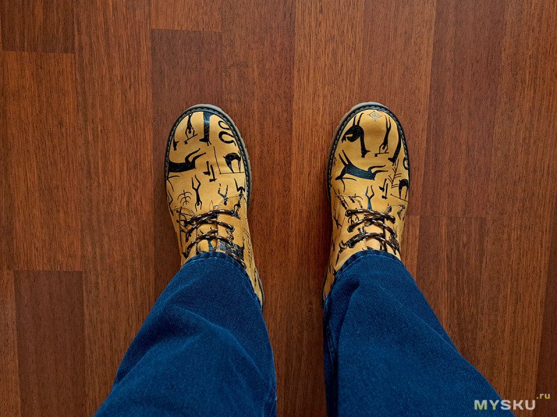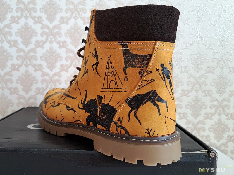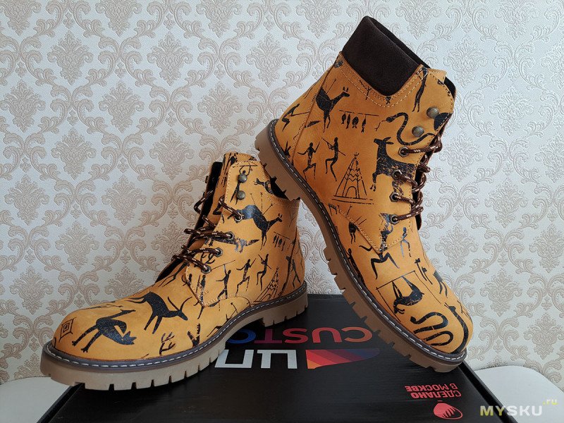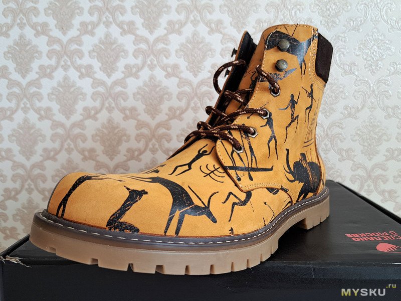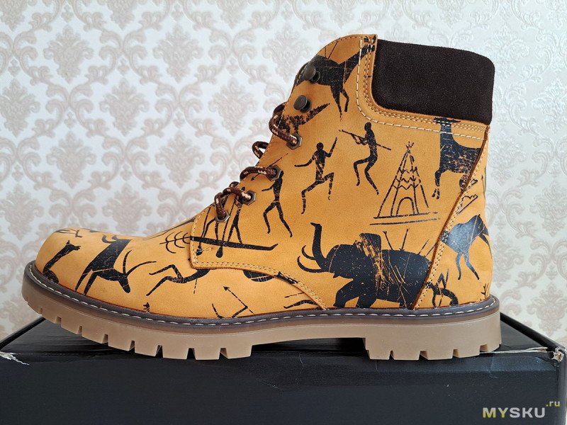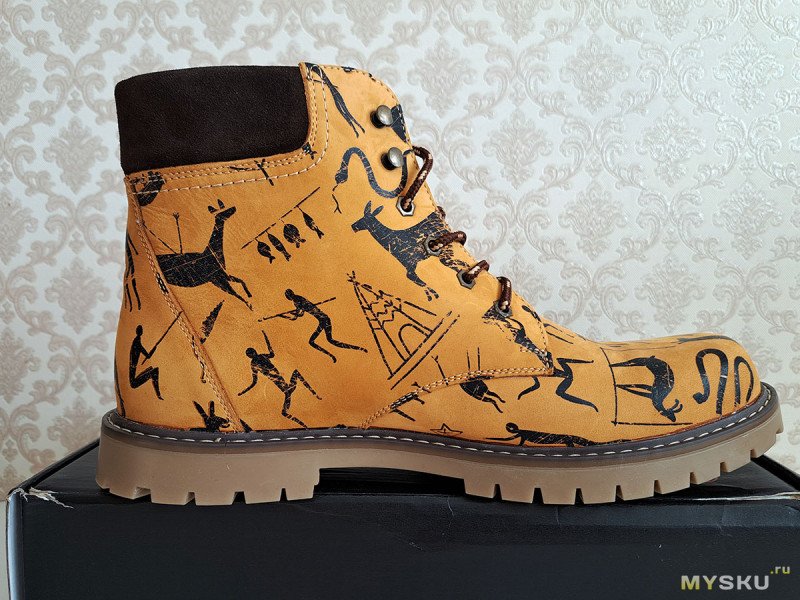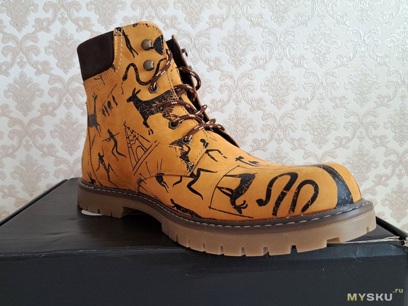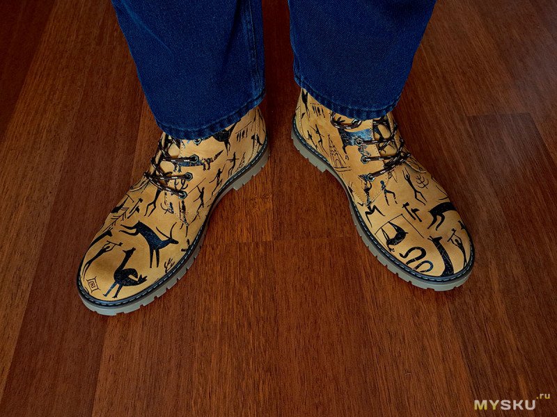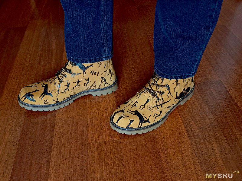 Я практически никогда не покупаю обувь «по прихоти», просто, потому что, захотелось. Но когда я увидел желтые ботинки с принтом в виде наскальных рисунков, то сердце приказало «покупай!». Так как давно люблю подобные принты, у меня несколько футболок от The Mountain в таком стиле. Ботинки стоили недорого – 17500 тенге (примерно 2800 руб.), так что, голова долго не сопротивлялась.