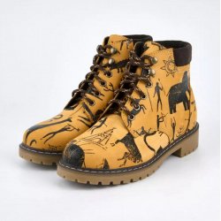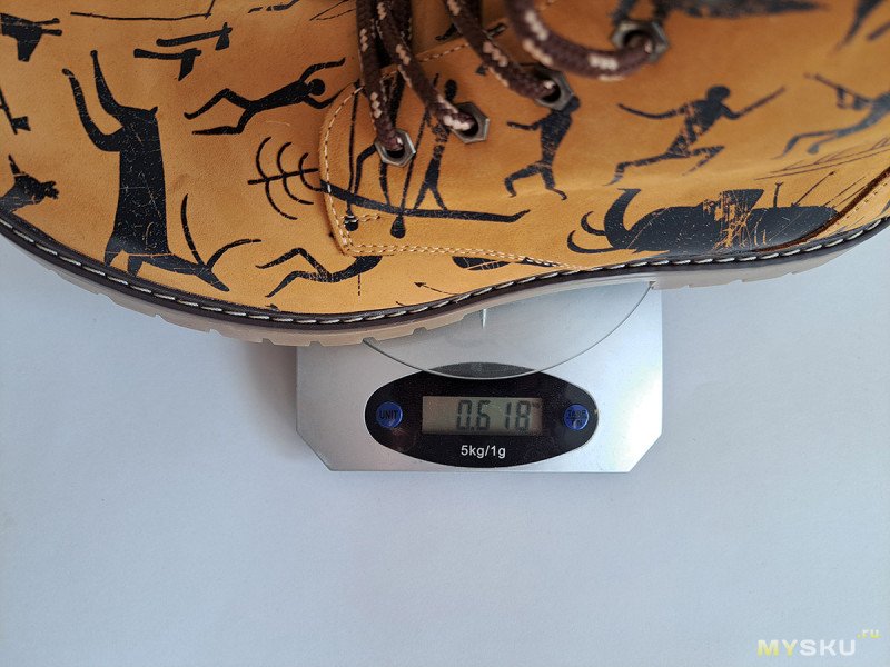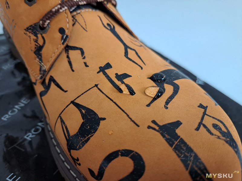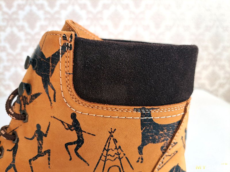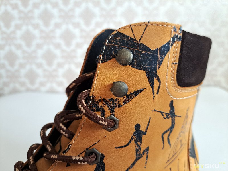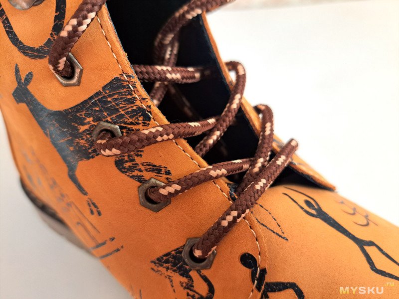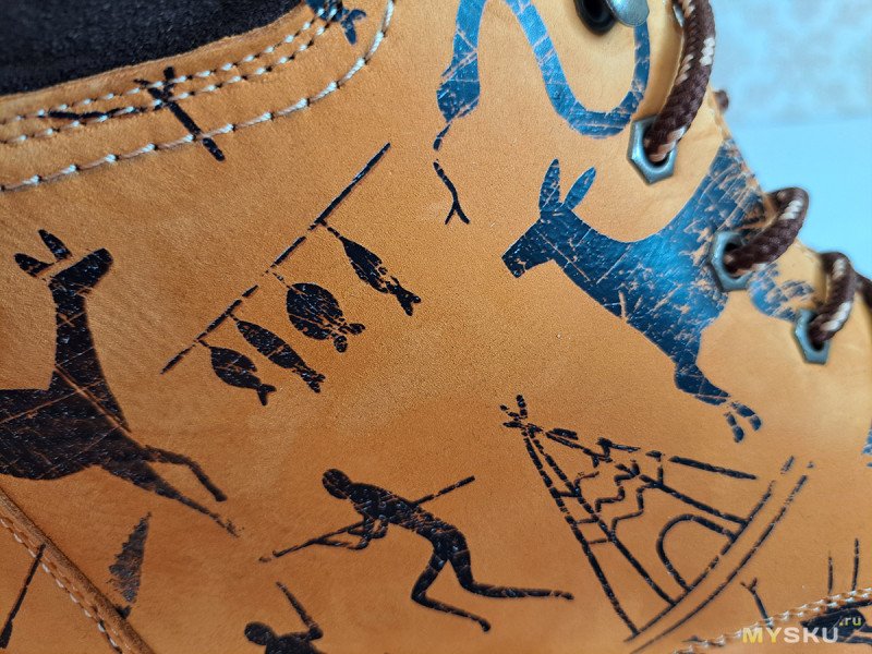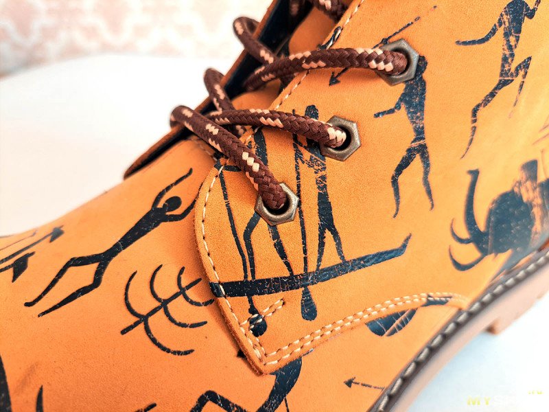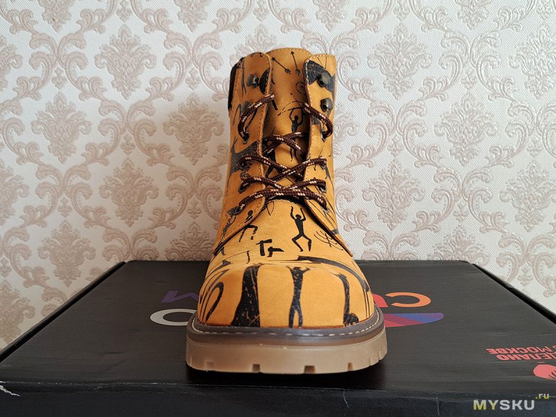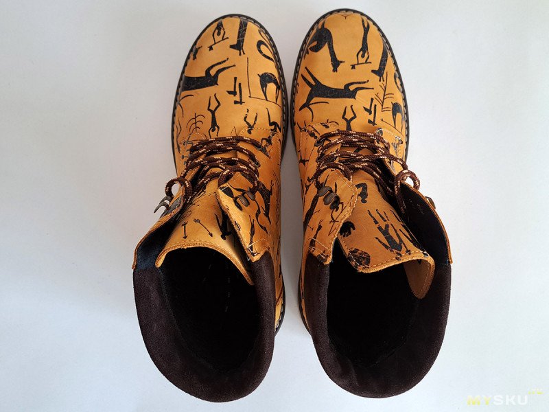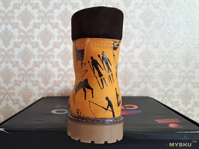 Я практически никогда не покупаю обувь «по прихоти», просто, потому что, захотелось. Но когда я увидел желтые ботинки с принтом в виде наскальных рисунков, то сердце приказало «покупай!». Так как давно люблю подобные принты, у меня несколько футболок от The Mountain в таком стиле. Ботинки стоили недорого – 17500 тенге (примерно 2800 руб.), так что, голова долго не сопротивлялась.