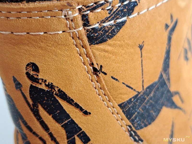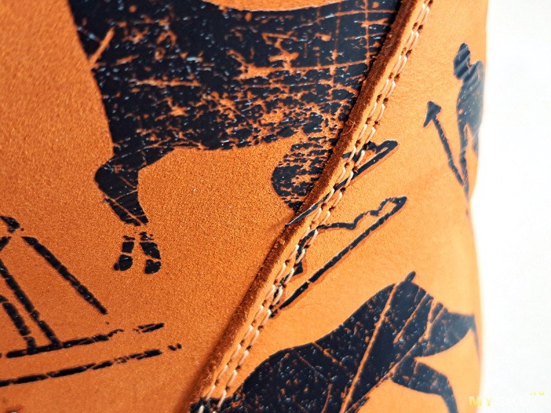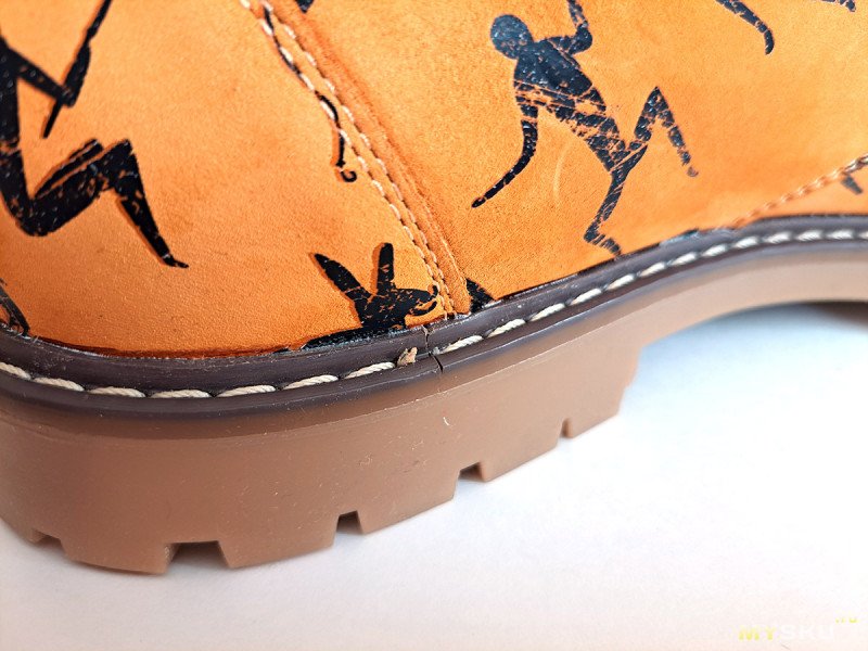 Если присмотреться, то видно местами кусочки торчащей на срезах пленки. То есть, не на готовые ботинки наносится рисунок, а детали выкраиваются из нубука с уже нанесенным принтом, и затем шьется обувь. Скорее всего, нанесение при помощи термопленки.