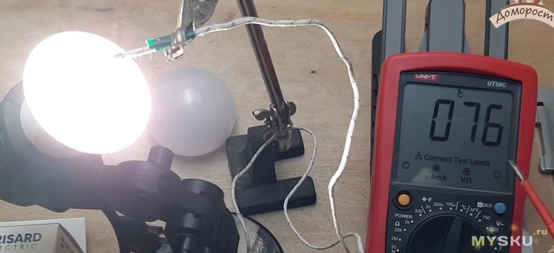 Самый частый убийца LED-ламп — это перегрев. Подключил термопару к самой горячей точке на плате диодов. После получаса работы под закрытым колпаком температура стабилизировалась на отметке 76 °C. Это очень хороший результат! Температура далека от критических 100-110 градусов, значит, деградация люминофора не начнется через месяц, и лампа должна прожить долго.