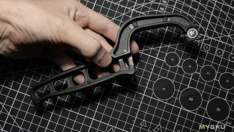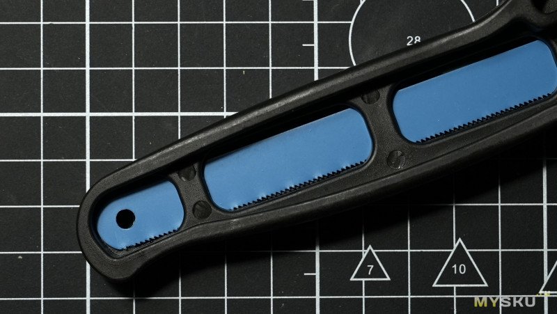Рукоять не напечатана на 3D-принтере, сделана из литого пластика. Хват не сказать что удобный, острые грани впиваются в ладонь и со временем будет ощущаться дискомфорт. Можно замотать изолентой на будущее. Не обязательно синей.