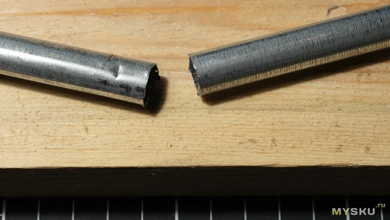 Здесь я пытался пилить, выходя за пределы поддерживающей арки. Полотно изогнулось где-то на середине среза трубки, остальное я допиливал, стараясь работать пилой внутри поддерживающий арки.