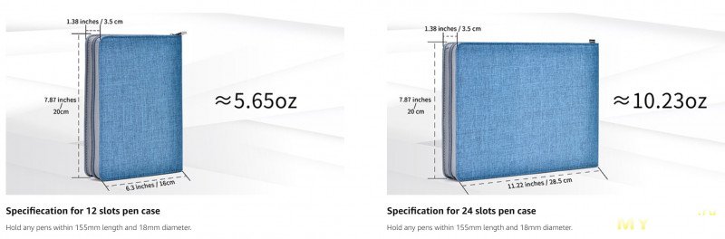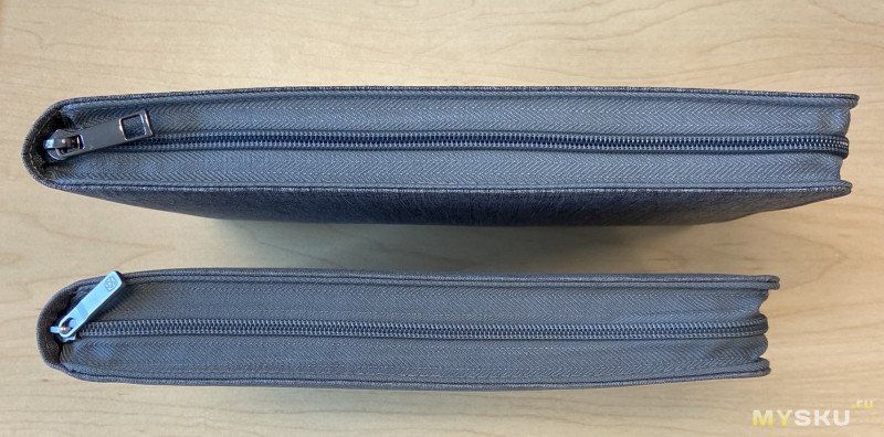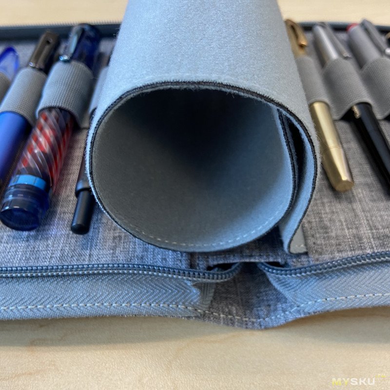 Любопытно, что к моменту написания обзора появился пенал приятного голубого цвета (помимо серого), плюс добавился пенал на 12 ручек с таким же расположением ручек, как и у большого брата (вертикальным, а не горизонтальным). Сразу же укажу размеры — большой чехол примерно 20 на 29 см, маленький — 20 на 16 см. Толщина у обоих одинакова — 3.5 см. Рекомендуемый размер хранимых ручек — 15.5 см в длину, и 1.8 см в диаметре, что с лихвой покрывает большинство современных и не очень ручек.