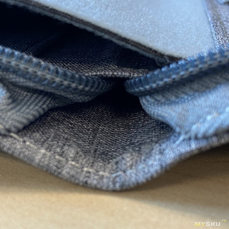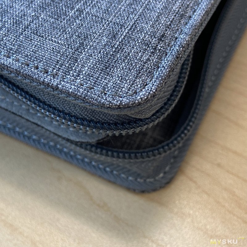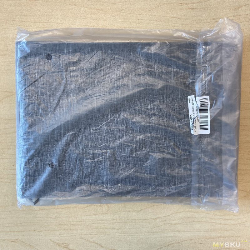 Материал чехла — холст, цвет — серый, обещают водонепроницаемость (не проверял), швы прошиты хорошо, молния работает отлично, нигде ничего не заедает. На ощупь материал приятный, кожу пальцев не цепляет, умеренно мягкий.