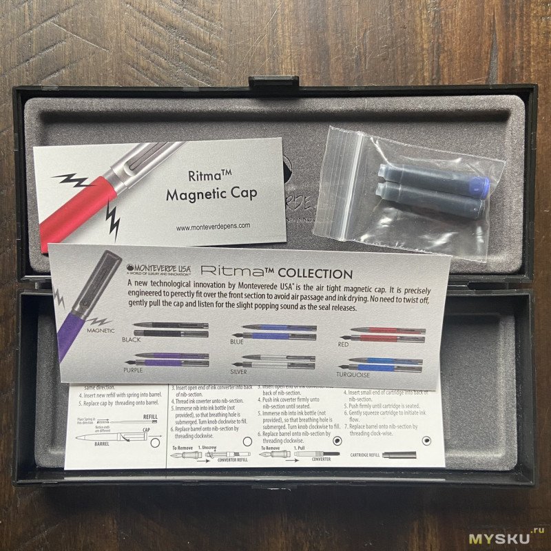 Тут всё на прилично-подарочном уровне — картонная обечайка, внутри которой находится пластиковый кейс, внутри которого лежит ручка, инструкция и два коротких картриджа формата Standard International.