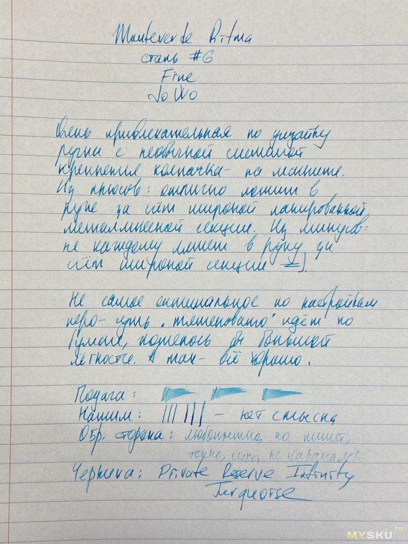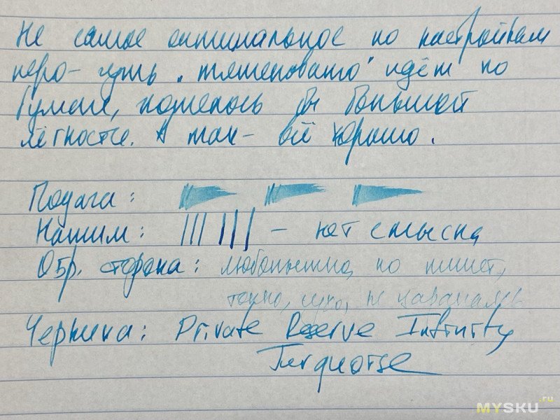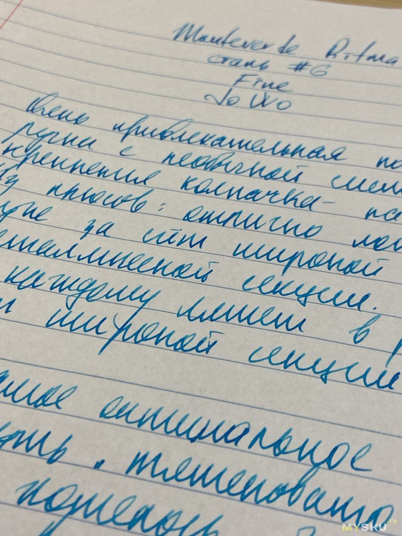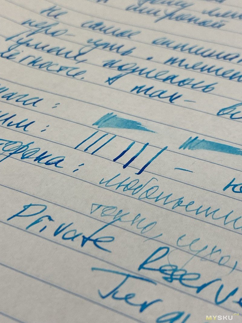 Перо по бумаге идёт довольно гладко, с небольшим шуршанием (но тактильного фидбека нет), линия умеренно тонкая (что соответствует моему пониманию линии Fine), подача умеренно-обильная. Обратной стороной перо пишет гладко и тонко, нажимать же на перо не стоит совершенно — это гвоздь-гвоздиком. Хорошее перо.